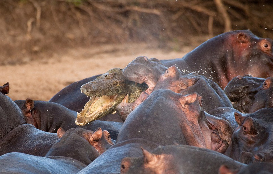 一条鳄鱼悄悄混入了正在河里洗澡的河马中,它很快就被敏感的母河马发现。愤怒的河马们立刻对它发起了猛烈地攻击,这条冒失的鳄鱼很快死于非命。