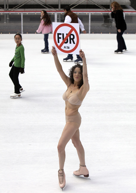 11月24日,美国花样滑冰的传奇人物、1979年世界花滑锦标赛冠军得主芭比洛尼在纽约洛克菲勒广场复出“裸滑”。这次表演是为了支持善待动物协会的反对皮草行动。