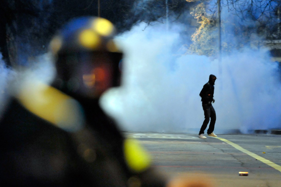 11月28日,在瑞士日内瓦发生的抗议世界贸易组织的游行活动引发暴力冲突,部分游行者点燃汽车、砸毁商店并与防暴警察发生冲突。图片来源:中国新闻网