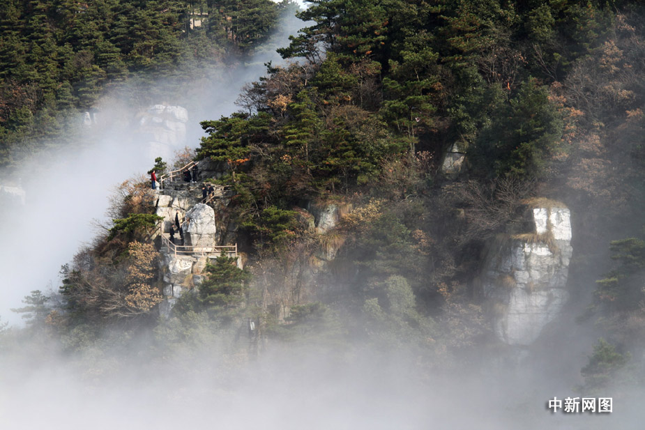 11月29日,受北方弱冷空气影响,庐山出现平流云、佛光奇观,佛光持续了近二个多小时。当日,整个庐山被浓浓的云雾所笼罩,若隐若现,宛如仙境。(胡国林 陈飞)