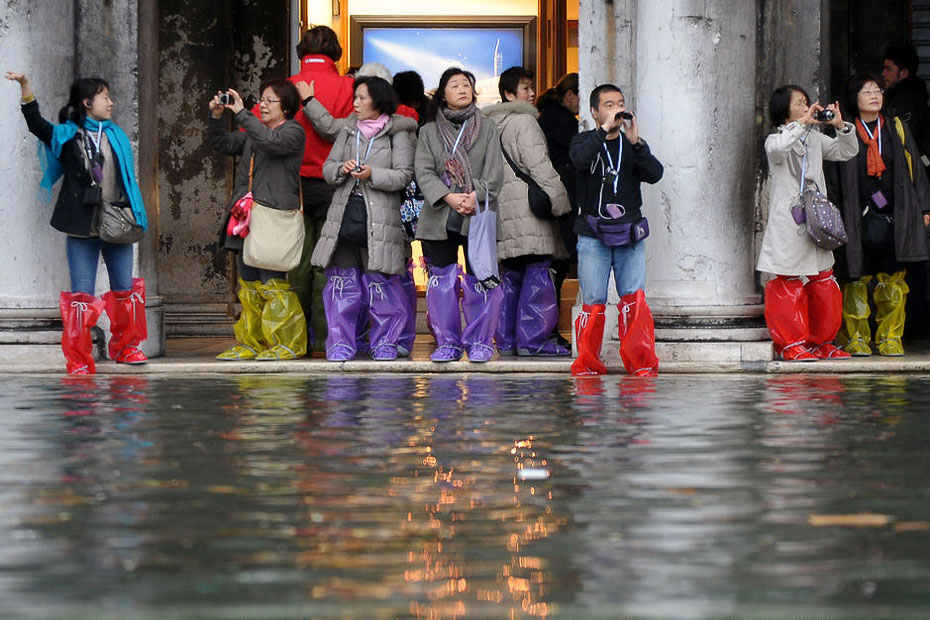 图为一群游客穿着雨靴在被水淹没的圣马可广场上拍照。