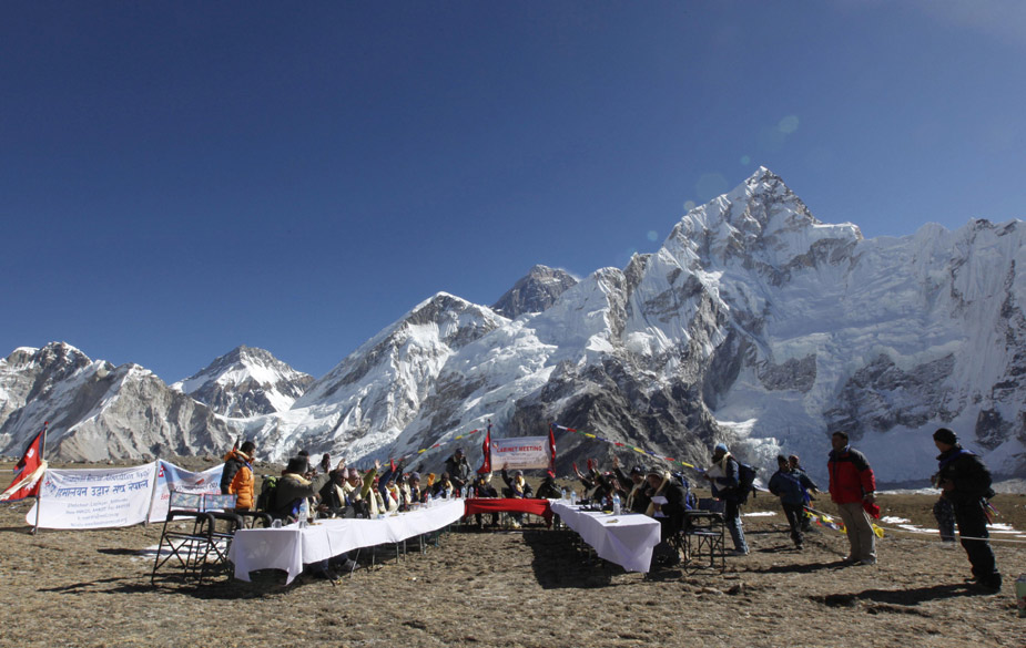 12月4日,尼泊尔总理和22位部长在喜马拉雅山海拔5262米的高度举行内阁会议,讨论全球变暖对喜马拉雅山的影响。呼吁人们切实采取行动,保护环境。