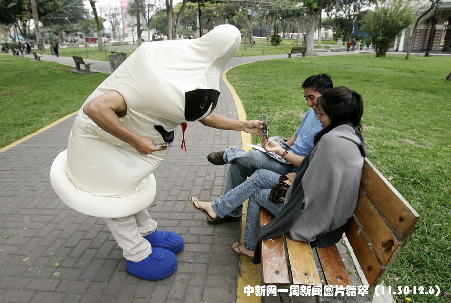12月1日,世界艾滋病日,智利首都利马的一对情侣从防艾宣传者中接过避孕套。图片来源:中国新闻网
