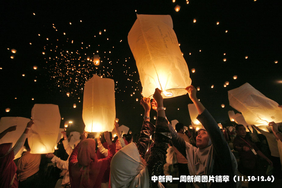 12月5日,在印度尼西亚首都雅加达,人们将孔明灯升上天空。当晚有数千人参加放灯活动,试图打破“数量最多的孔明灯同时升空”的吉尼斯世界纪录。最终有10000个孔明灯升上夜空。图片来源:中国新闻网