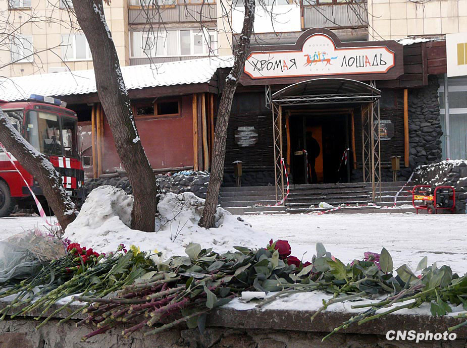 十二月六日,俄罗斯彼尔姆市民众自发来到夜总会火灾事故现场,悼念遇难者。图中红色建筑即为失火夜总会。中新社发 田冰 摄