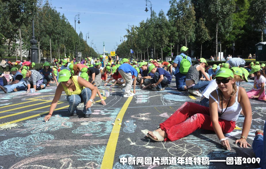 最多参加的粉笔画:9月20日,世界无车日,在匈牙利首都布达佩斯的一条街道上5317人同时参加粉笔画制作,打破了以前的吉尼斯世界纪录。图片来源:中国新闻网