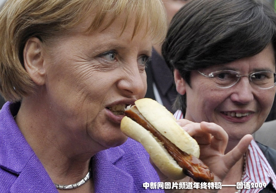 美食的诱惑:2009年9月27日,德国总理默克尔在德国东部爱尔福特市访问时,大吃香肠。