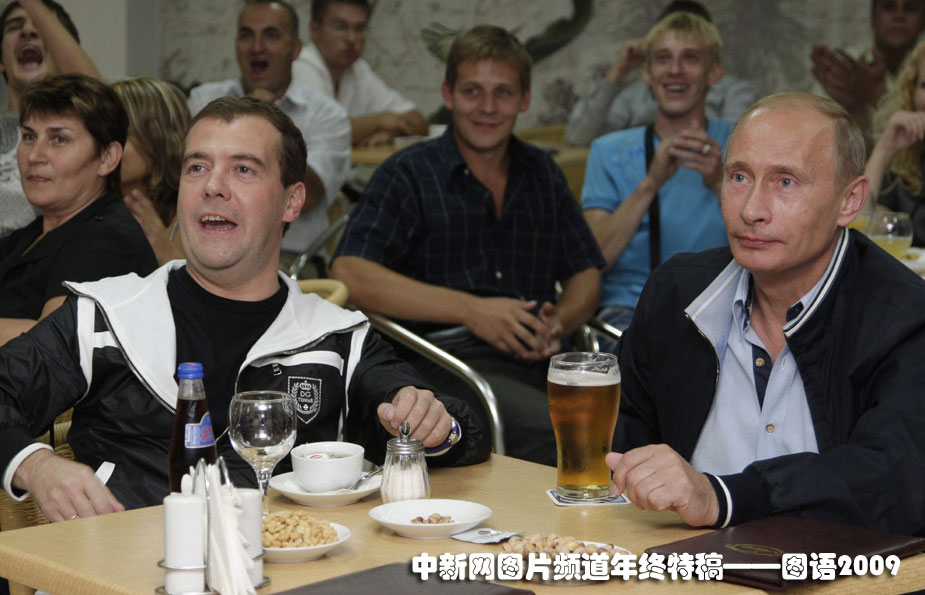 兄弟同乐:2009年8月12日,俄罗斯总统梅德韦杰夫、总理普京在一家咖啡厅里观看了俄罗斯与阿根廷足球友谊赛的电视直播。