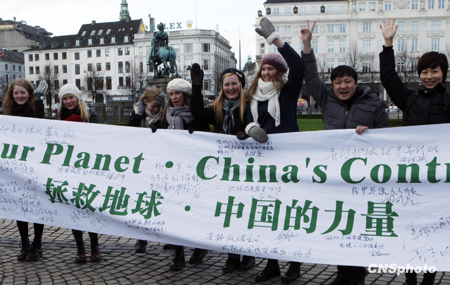 12月12日,正在丹麦哥本哈根召开的联合国气候会议举行部分与会国会外会议,500多个来自70多个国家和组织的成员以及当地环保者6万多人汇集哥本哈根市贝拉会展中心进行大游行。图为在哥本哈根环保大游行醒目的中国“环保先锋行活动”。 中新社发 钱兴强 摄