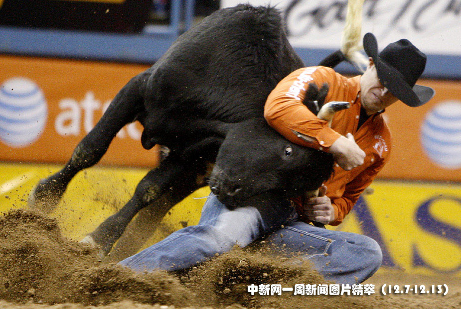 11日(周五),美国拉斯维加斯,一位全美斗牛竞技好手正在与公牛“摔跤”。图片来源:中国新闻网