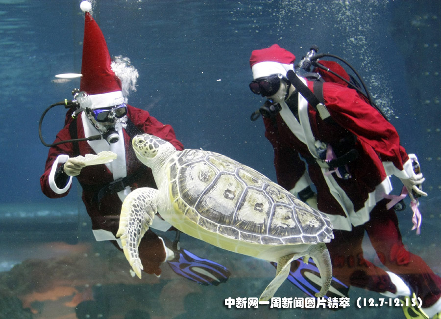 13日(周日),在韩国首尔的水族馆,两位饲养员身着圣诞老人的服饰在水中与海龟“同游”。图片来源:中国新闻网