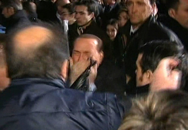 时值政治盟友冲刺阶段,贝卢斯科尼照例参加自己党派的集会。就在他给支持者签名时,人群中一名中年男子突然殴打其面部。当地电视台画面显示,跌倒在地的贝卢斯科尼被助手扶起时,口鼻出血,面部淤青,表情痛苦。