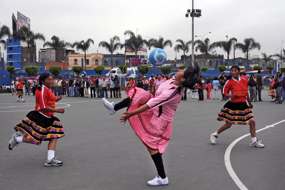 12月12日,秘鲁印第安妇女在利马国家体育场外举办了一场特别的足球赛,所有的球员均身着传统服饰光脚上阵妙趣横生。图片来源:中国新闻网
