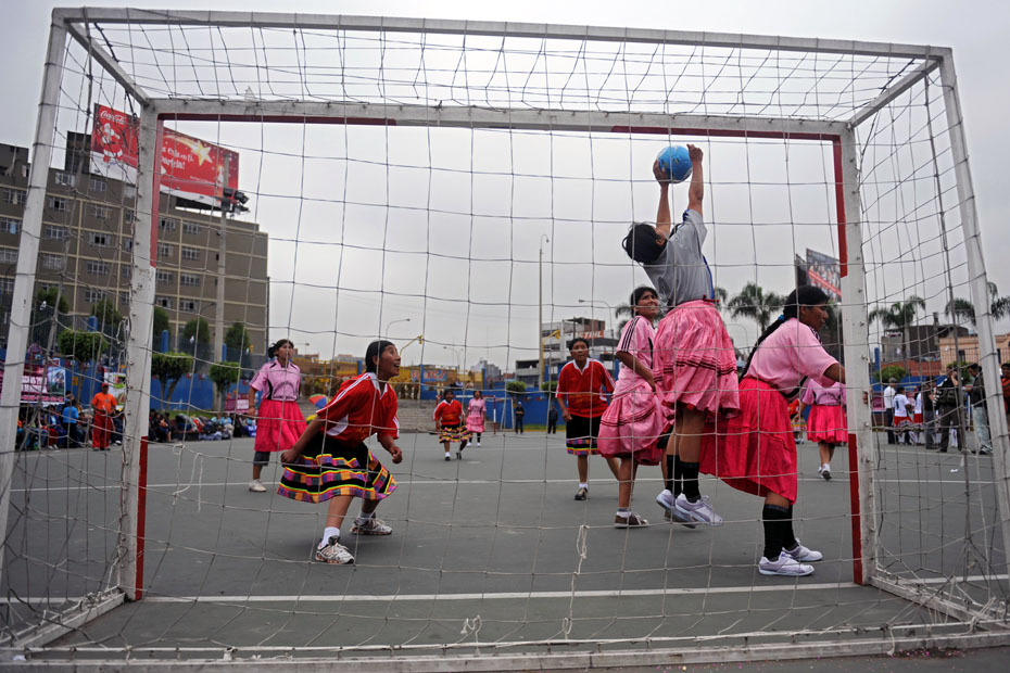 12月12日,秘鲁印第安妇女在利马国家体育场外举办了一场特别的足球赛,所有的球员均身着传统服饰光脚上阵妙趣横生。图片来源:中国新闻网