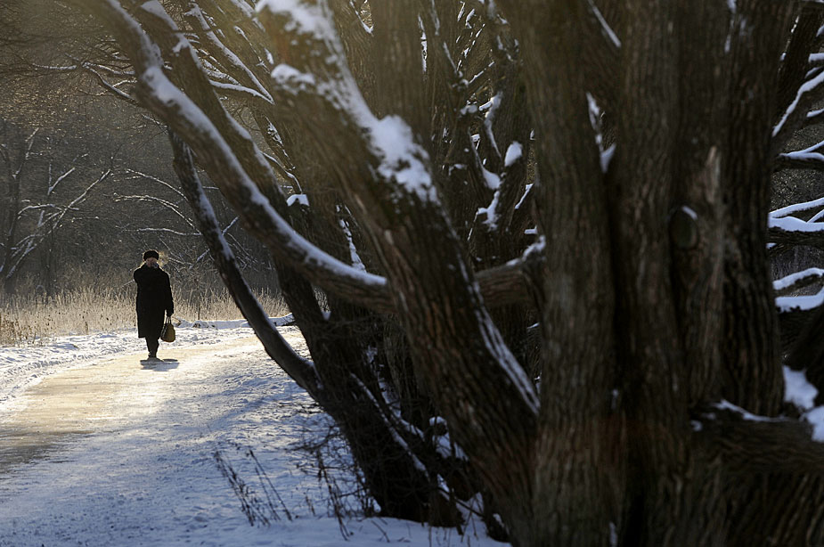 12月16日,俄罗斯莫斯科一名女子在雪中行走。