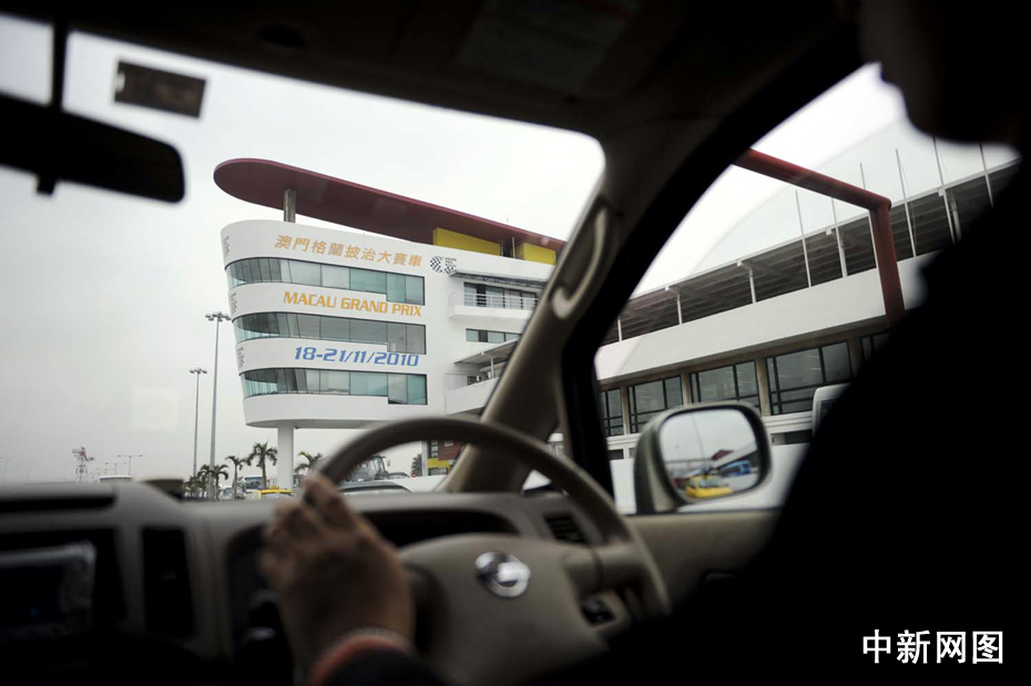 澳门民众开车路过澳门赛车场,在平日里这个赛场的赛道作为普通道路供车辆行驶。中新社记者 廖攀 摄