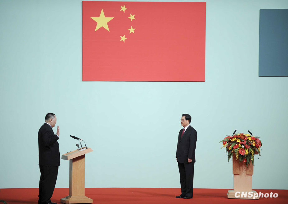 12月20日,庆祝澳门回归祖国十周年大会暨澳门特别行政区第三届政府就职典礼在澳门东亚运动会体育馆举行。澳门特区第三任行政长官崔世安宣誓就职,国家主席胡锦涛监誓。中新社记者 廖攀 摄