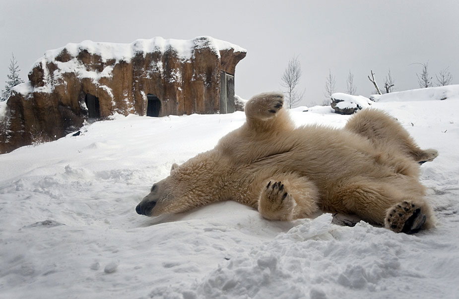 图为12月20日,荷兰鹿特丹动物园内北极熊正在享受积雪所带来的乐趣。