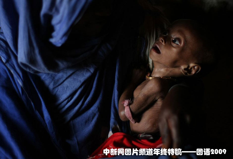 2009年7月11日,在索马里首都摩加迪沙市郊的帐篷里,一个遭受严重营养不良的男孩紧紧依偎在他母亲的怀里。