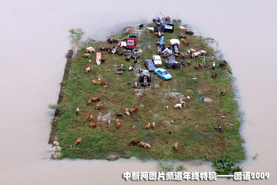 2009年11月8日,随着雨季来临,马来西亚吉兰丹州的杰拉珀登斯村庄发生洪水,数百名村民被撤离到这一地区。这张图片是从空中拍摄的,可以看到被洪水围困的奶牛和汽车。