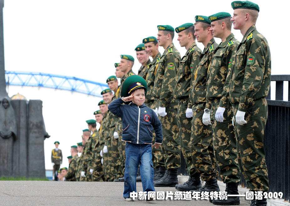 2009年5月28日,白俄罗斯边防日,一名男孩向士兵们敬礼。