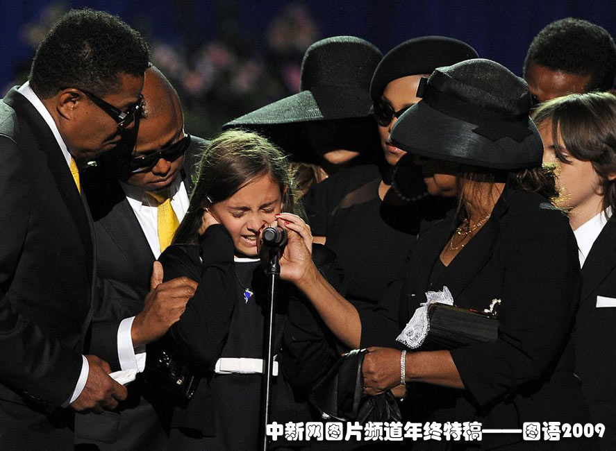 2009年7月7日,在洛杉矶斯坦普斯中心举行了纪念迈克尔·杰克逊的追思会。迈克尔·杰克逊是乐坛传奇,死于2009年6月25日。追思会上,迈克尔·杰克逊的家族成员正在安慰的杰克逊的女儿帕丽斯(中)。
