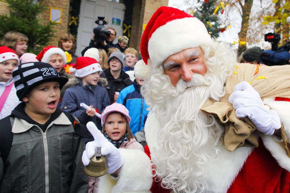 图为德国一名男子打扮成圣诞老人在邮局前与孩子们玩耍。