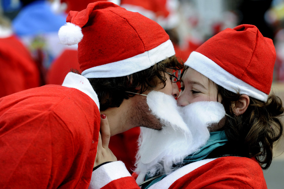 图为波尔图街头的一对夫妇打扮成圣诞老人在圣诞游行中接吻。