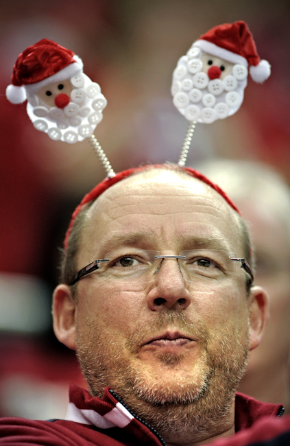 图为挪威一名球迷头戴圣诞老人发卡观看比赛。