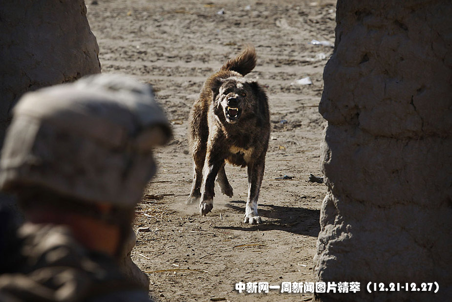 23日(周三),在阿富汗赫尔曼省的加姆赛尔(Garmsir),一条狗向一名美国海军士兵狂吠不止。
