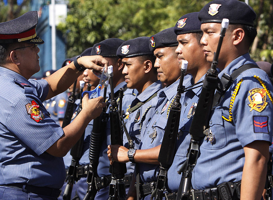 12月29日,菲律宾首都南部的塔吉格市警察部队为了防止警务人员在庆祝新年时胡乱开枪,下令用胶纸把枪口封起来。图片来源:中国新闻网