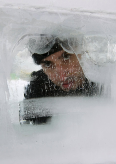 当地时间29日早上8点起,以色列魔术师赫齐·达扬在位于特拉维夫的拉宾广场上,达扬赤身进入一块8吨重的冰块里,开始了挑战冰屋生存世界纪录之旅。图片来源:中国新闻网