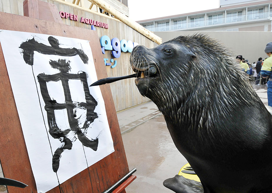 12月30日,日本神奈川八景岛海洋乐园水族馆内,海狮表演了用毛笔在纸上“写”汉字的节目。图片来源:中国新闻网