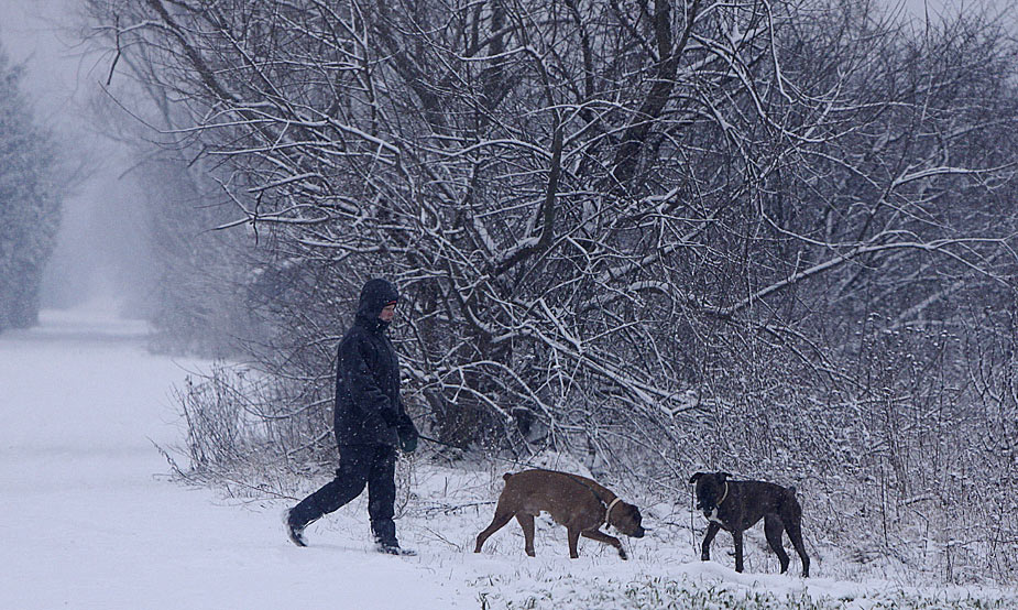 图为12月29日,波兰首都华沙人们在雪中溜狗。