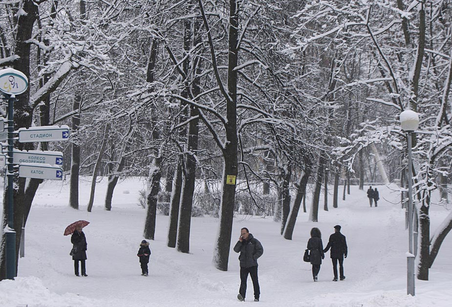 图为12月29日,白俄罗斯首都明斯克大街上满是积雪。