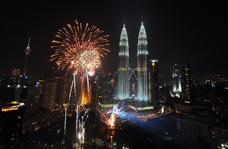 图为2010年1月1日,马来西亚吉隆坡的双子星大厦前,烟花璀璨。