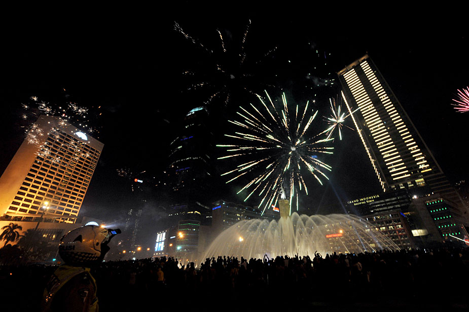 图为2010年1月1日,印尼首都雅加达人们燃放起炫丽的烟花。