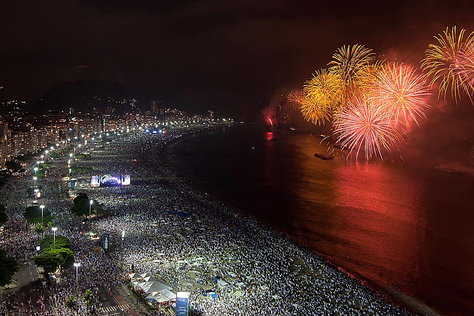 图为2010年1月1日,巴西里约热内卢的科帕卡巴纳海滩燃放烟花,引来大量游客观看。