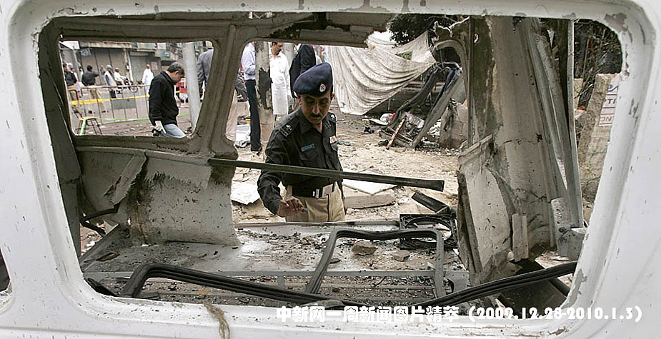周一(28日),巴基斯坦卡拉奇发生一起自杀式爆炸袭击事件。当地警方正在查看被损坏的车辆。图片来源:中国新闻网