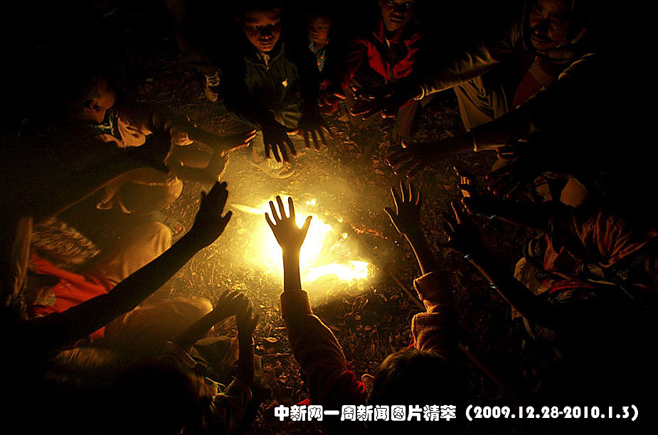 周二(29日),在印度布巴内斯瓦尔一个贫民窟内,一群孩子围在火堆旁烤火取暖。这个地区正在经历严寒天气。图片来源:中国新闻网