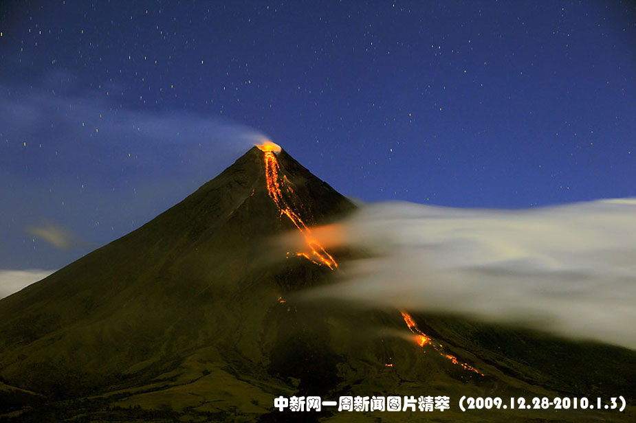 周二(29日)在菲律宾黎牙实比,岩浆从马荣火山山口流出。由于该火山开始爆发,大约有5万人被撤离到临时房屋中。图片来源:中国新闻网