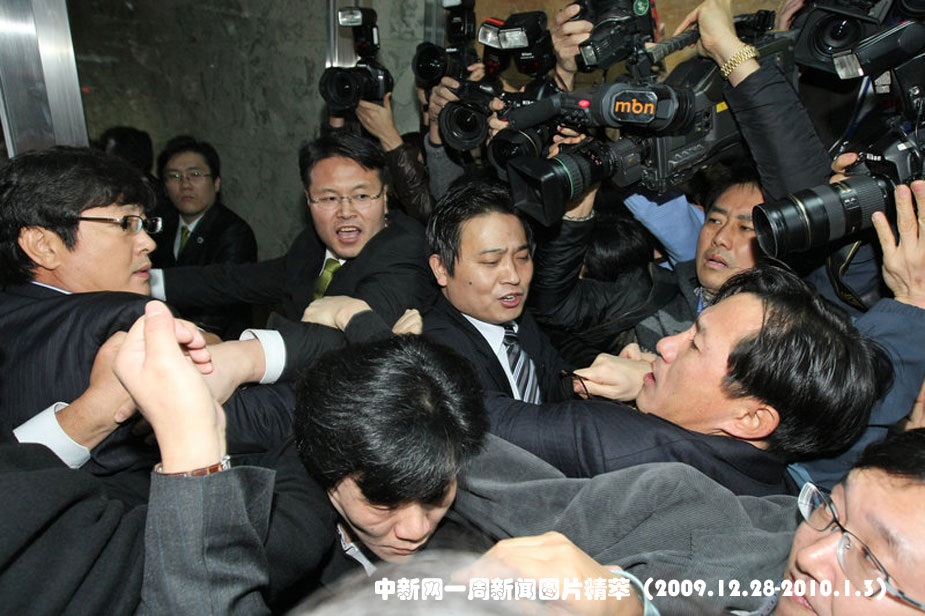 周四(31日),韩国大国家党当日决定在国会245室进行预决委审议之后,民主党议员赶往现场,与大国家党议员发生了肢体冲突。图片来源:中国新闻网