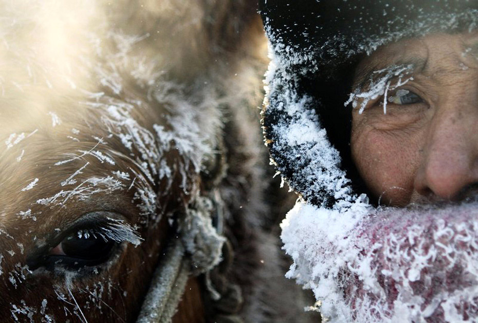 1月4日,黑龙江省安达市牲畜交易市场一农民和他的马在寒冷的天气中。盛红旭 摄