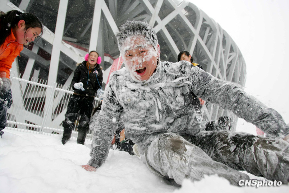 1月3日,北京城降下大雪,北京地区气温逼近40年来的历史低温极值。图为年轻人在鸟巢旁打雪仗。中新社发 富田 摄