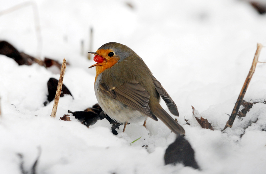 1月5日,德国,一只知更鸟正在吃着大餐欣赏雪景。