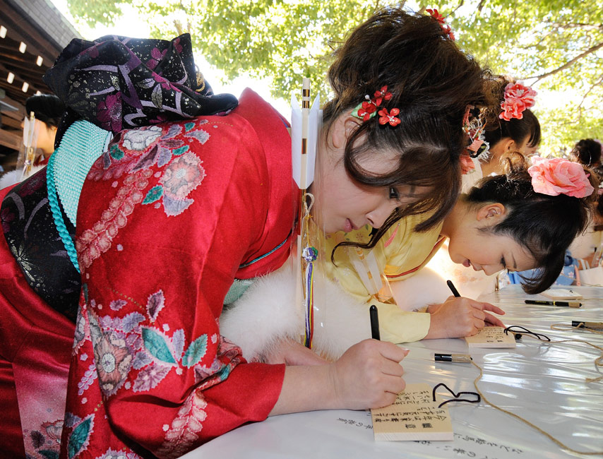 日本年轻女孩穿和服祈福迎接成人节