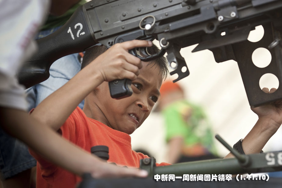 1月9日(周六),当天是泰国的儿童节,一名男孩正在体验没有装弹的机枪。图片来源:中国新闻网