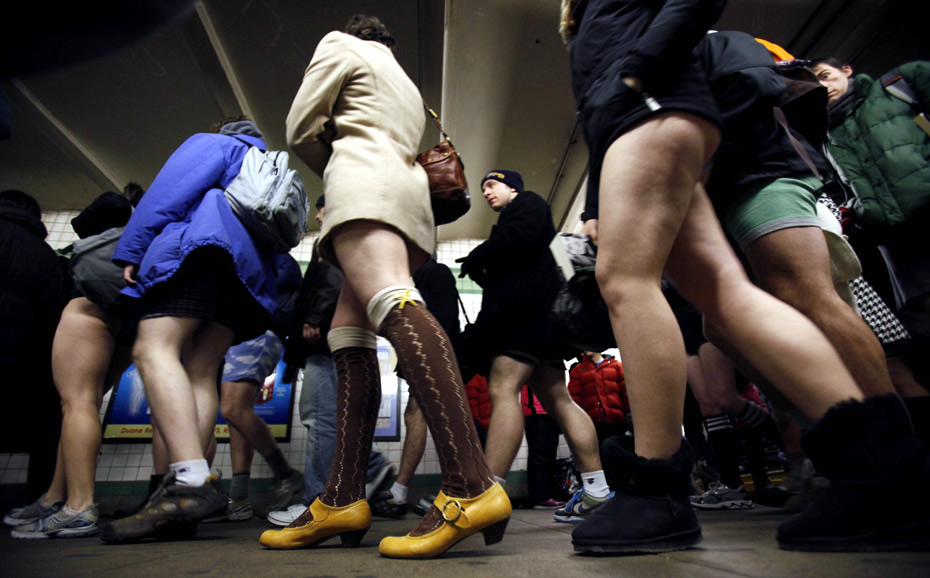 2010年1月10日,纽约,地铁里一群不穿裤子的乘客。第9届“不穿裤子乘地铁”活动当日在全球16个国家的44座城市举行。图片来源:中国新闻网