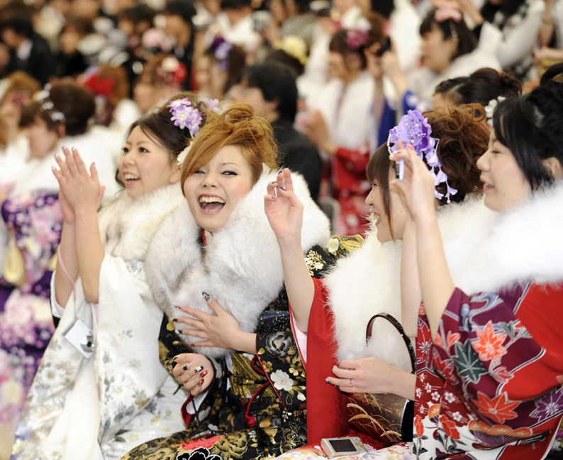 1月11日,日本迎来2010年的成人节日,所有年满20岁的年轻人都将在这一天宣告自己迈进了成人行列。众多年轻的日本女孩身穿和服在东京迪斯尼乐园里快乐游玩,迎接自己的节日。
