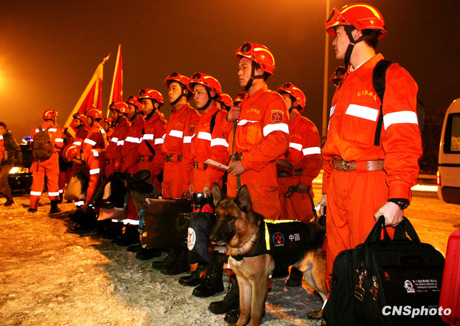 1月13日晚,中国国际救援队从首都国际机场搭乘飞赴海地执行救援任务。据悉,救援队一行共计68人,由三个分队组成,包括来自国家地震局的10人专家分队等。据了解,救援队随机携带了总价值约1200万元人民币的10余吨救灾物资,其中包括救援、通讯、后勤保障、医疗、食品在内等物资设备和三只搜救犬。中新社发 雷虹 摄